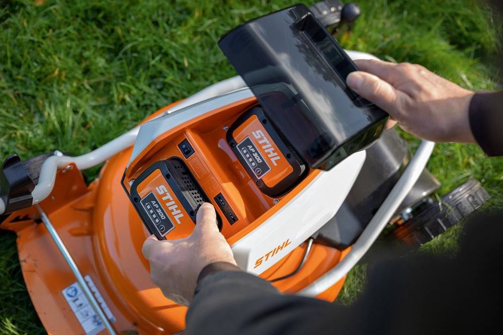36V AP PRO liitiumioon akude akupesasid on niidukil kaks ja automaatse ümber lülitusega.